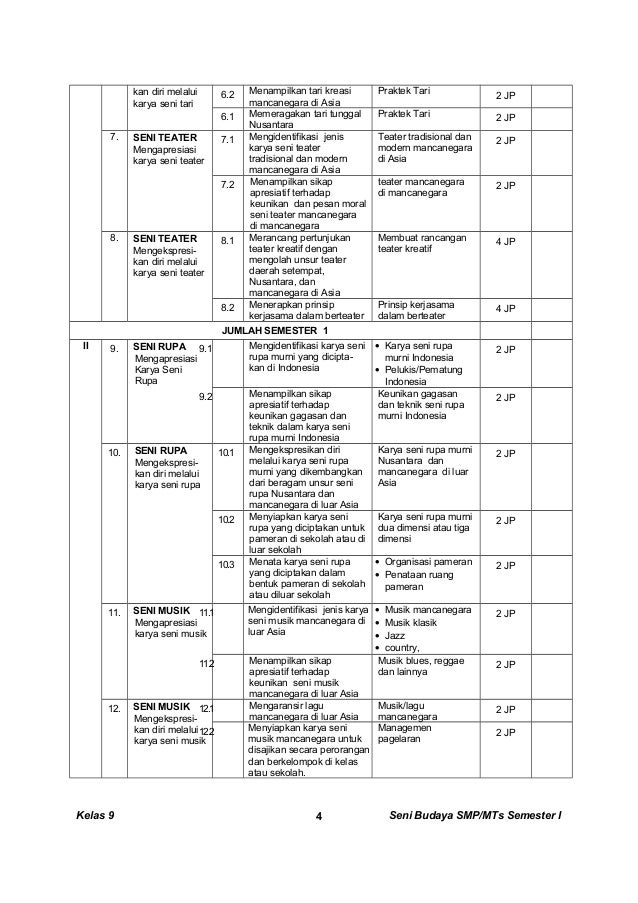 Rpp k13 revisi 2017 seni budaya smp kelas 7 8 9 semester 1. Rpp seni budaya k13 kelas 7 8 9 revisi 20172018 ini merupakan file terbaru yang akan saya bagikan pada postingan kali ini. Bagi rekanrekan guru yang belum memiliki rpp untuk digunakan untuk tahun ajaran baru nanti, anda bisa download rpp seni budaya smp/mts kurikulum 2013 yang saya bagikan ini secara gratis. Rpp seni musik smp kelas 9/1 pashaiful.Blogspot. Rpp seni musik smp kelas 9/1 sekolah smp n pekalongan. Mata pelajaran seni budaya/ seni musik. Kelas/semester ix (sembilan)/1 (satu) kisikisi soal seni budaya kelas x ulangan akhir semester g anjil tahun istilah genre musik, pengertian genre musi bahan ajar semester 1 kelas 8. Seni budaya dan keterampila, seni musik, kelas ix/9. A. Lagu tradisi dan lagu modern musik daerah atau musik traditional adalah musik yang lahir dan berkembang di daerahdaerah di seluruh wilayah indonesia. Rpp seni budaya smp kurikulum 2013 lengkap dan terbaru kelas. Rpp seni budaya smp kurikulum 2013 grati dan lengkap kelas 7, 8,9. Rpp seni budaya smp kurikulum 2013 rpp bahasa seni budaya smp dapat anda download pada blog ini secara gratis. Kumpulan soal seni budaya smp kelas 9 semester ganjil. Soal seni budaya smp kelas 9 semester ganjil bagi bapak dan ibu guru smp sebentar lagi akan memasuki akhir semester ganjil atau gasal, biasanya akan disibukkan dengan membuat soal untuk uas (ujian akhir semester) atau pas (penilaian akhir semester).